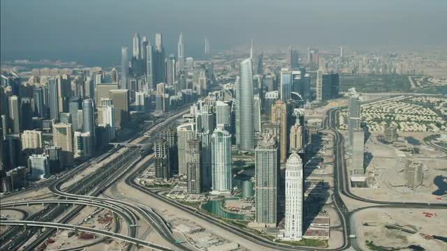 Aerial Dubai Skyline Skyscrapers Arabic Architecture Sheikh Zayed Road Dubai Metro Rail Emirates Hills Urban suburbs Persian Gulf UAE