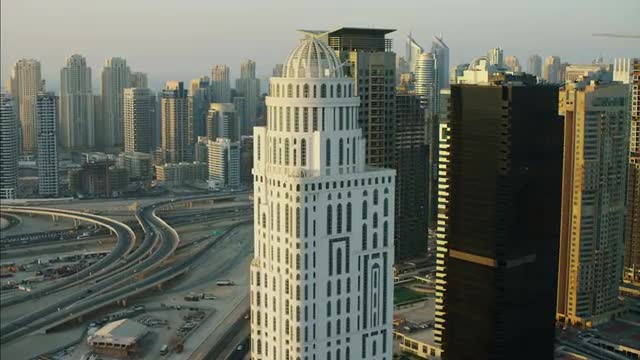 > Aerial Skyscrapers Dome Tower Dubai Sheikh Zayed Road UAE