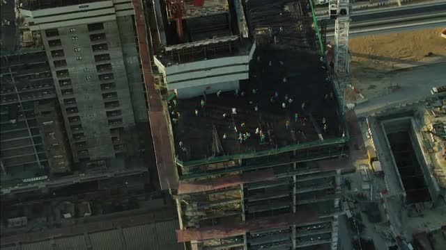 Dubai - December 2014: Aerial Dubai construction overhead Oil new high rise development Tower Building crane workers UAE RED EPIC