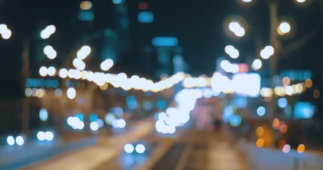 Defocused shot of city street lights and headlights of moving cars at night. Blurred urban scene in the evening
