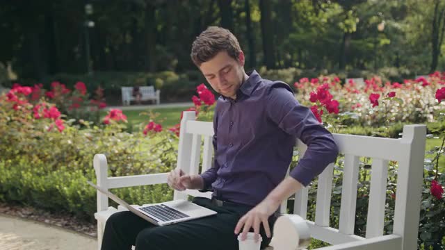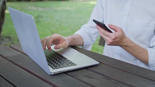 Pregnany woman typing on laptop in the park. She making pause in work to smooth the belly and calm the baby with the hand touches
