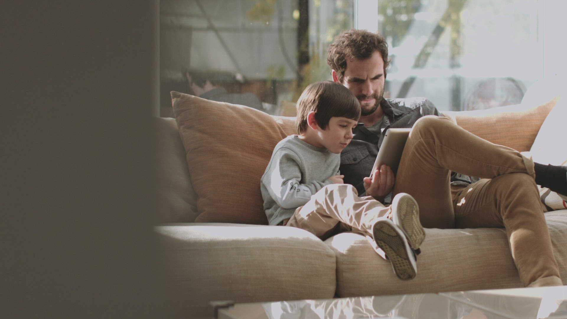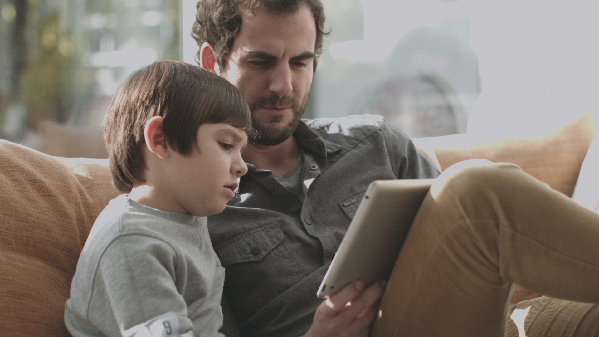 > Father and little son using tablet computer at home