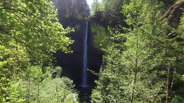 > Waterfall framed by trees, Columbia River Gorge, Oregon
