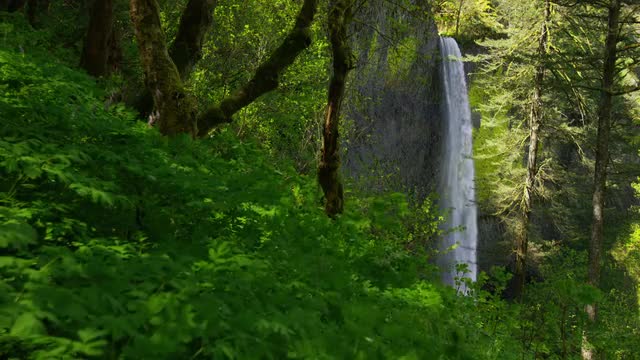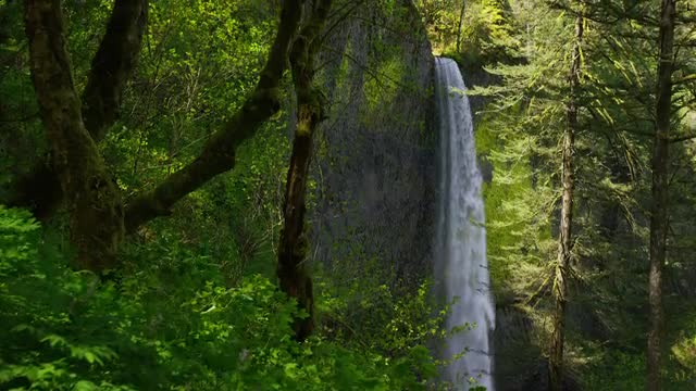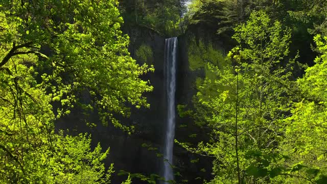 > Waterfall framed by trees, Columbia River Gorge, Oregon