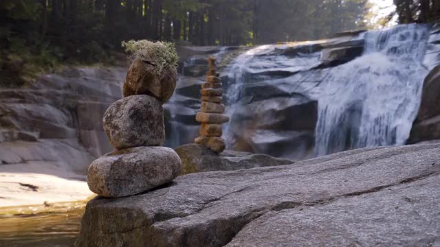 Backpacker crosses suspension bridge over waterfall