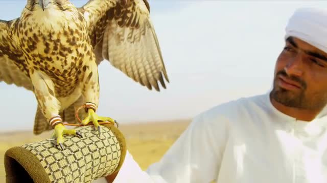Portrait close up Saker falcon displaying wings tethered to Arabic male owners wrist close up shot on RED EPIC