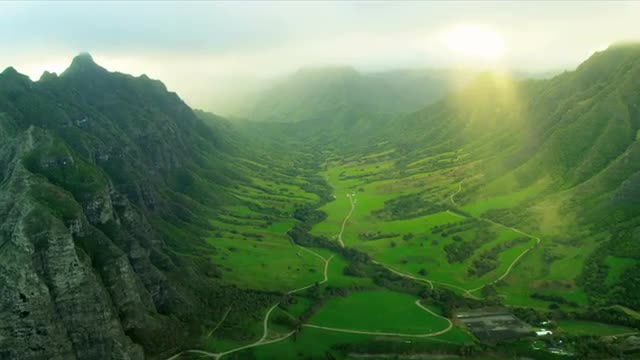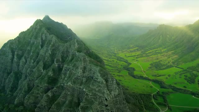 Aerial view Koolau mountain Range Windward side of Oahu Kahana Valley State Park, Hawaii, USA, RED EPIC