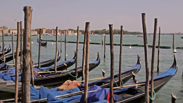 VENICE, ITALY - FEBRUARY 20, 2015: Slow motion steadicam shot of woman opening curtian. Two cargo boats sailing on the canal under the window. View through the glass