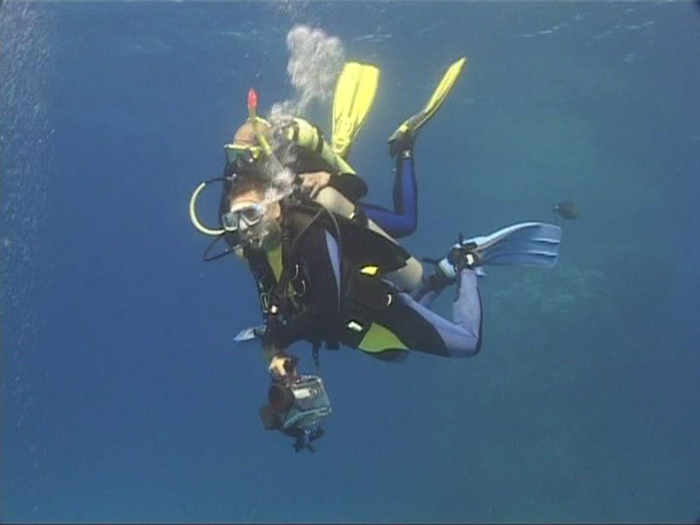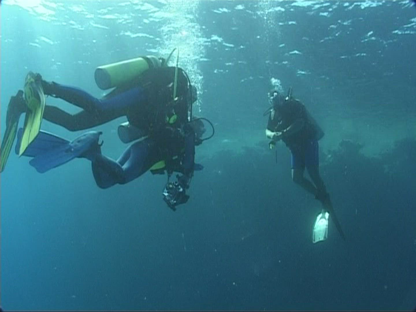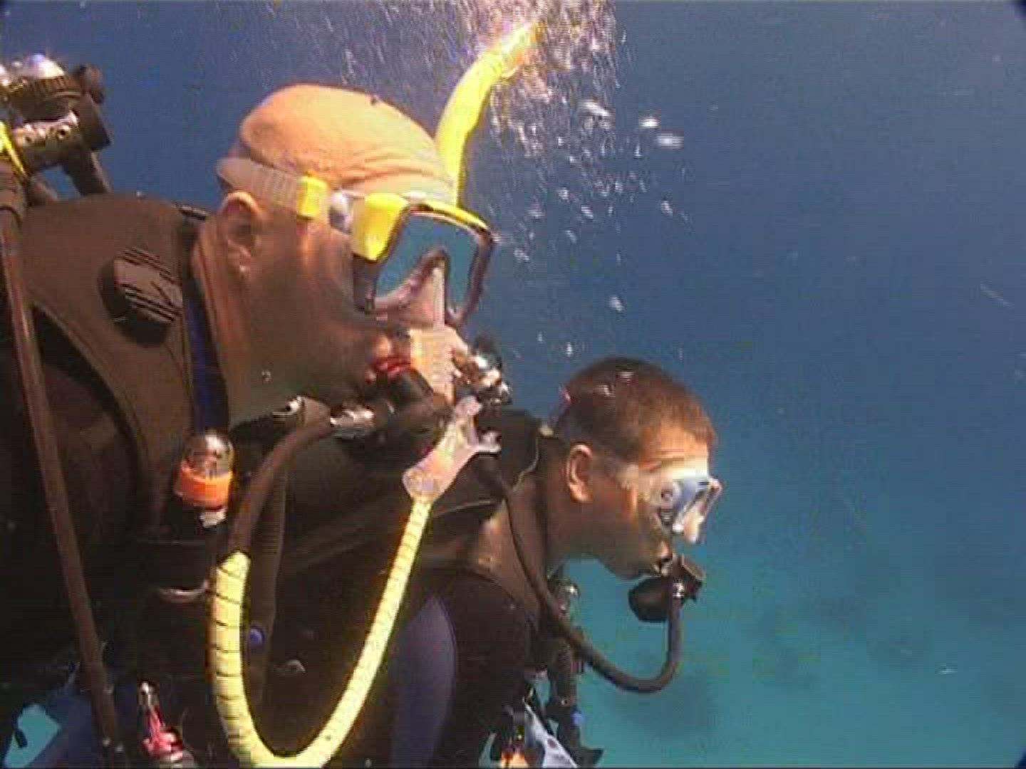 Slow motion shot of a diver breathing under the water. He is exhaling and air bubbles appear around him.