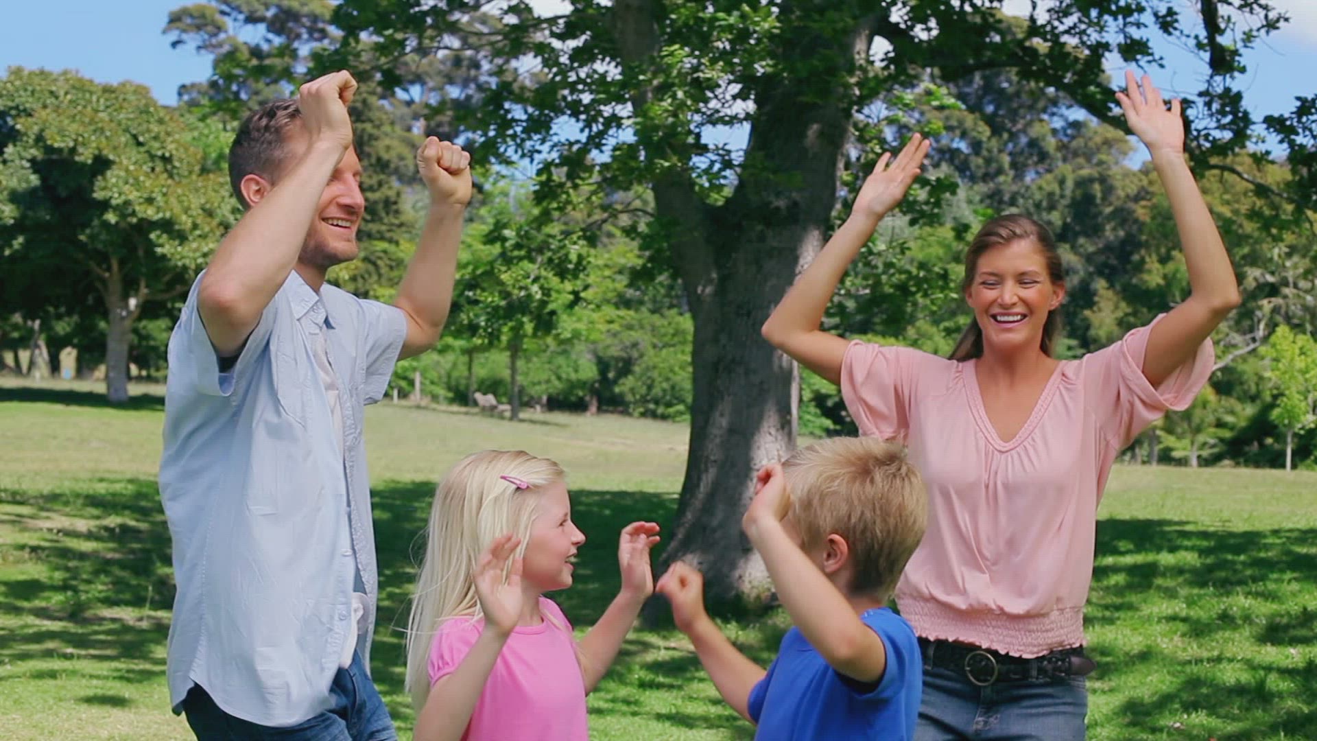Slow motion of big family with child in a cicrle holding hands. Their black silhouettes against colorful evening sky