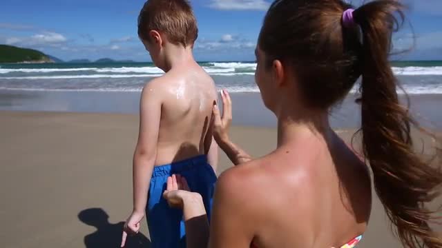 Slow motion of happy mother and father applying sunscreen cream on sons body on the beach. Sun protection on summer vacation