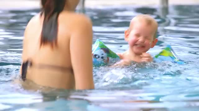 Slow motion clip of the father and son having fun in the outdoor swimming pool on tropical resort, they dive and then come up
