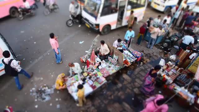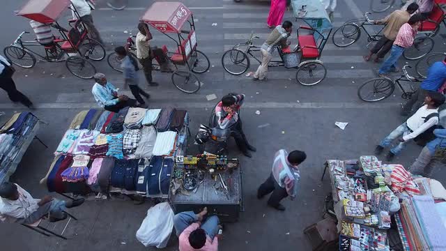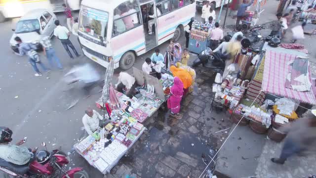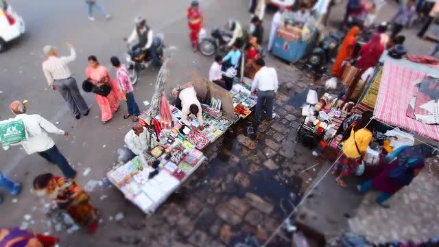 Slow motion shot of a woman standing by the street stall and picking coins to pay for fruit.