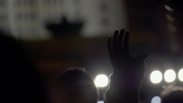 Slow motion shot of hands raised over the head to applaud to the artist on the stage.