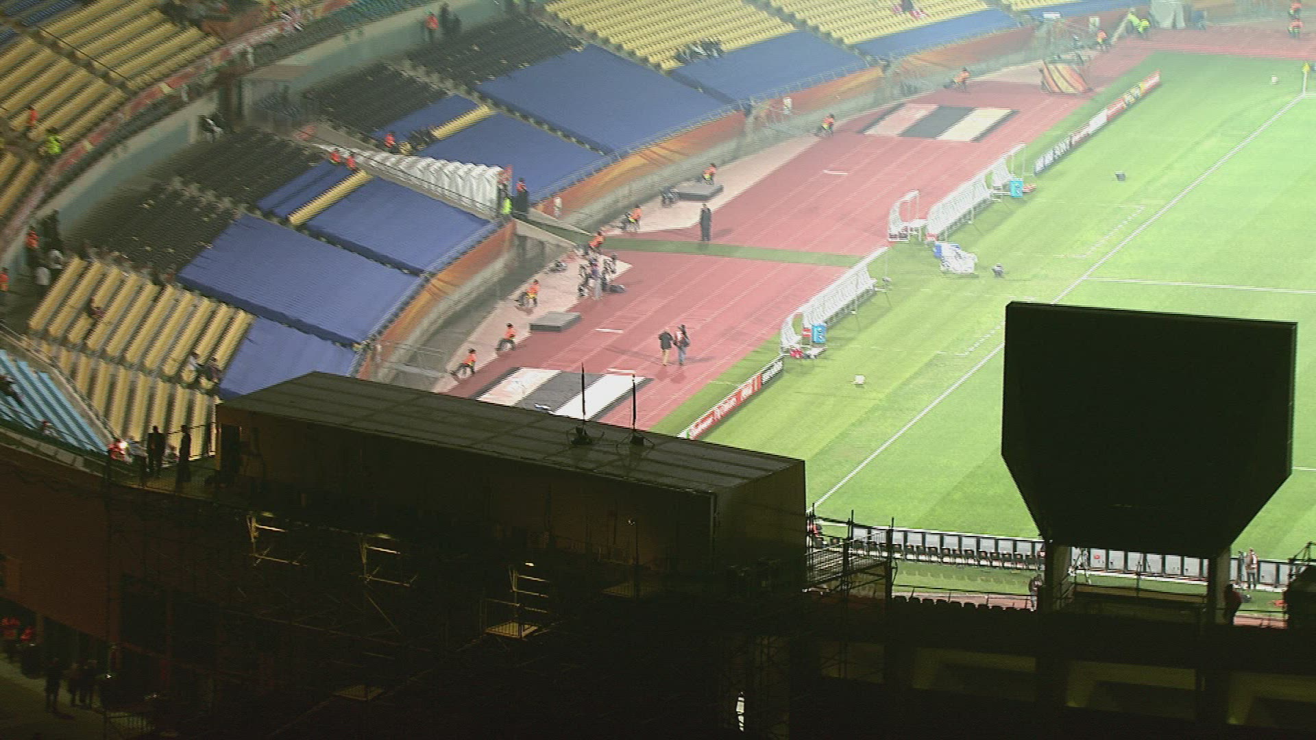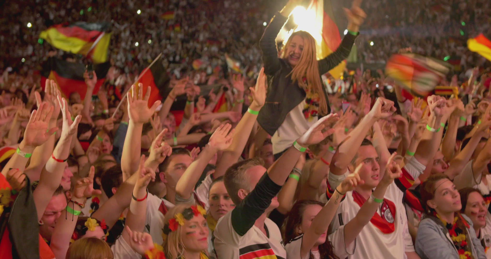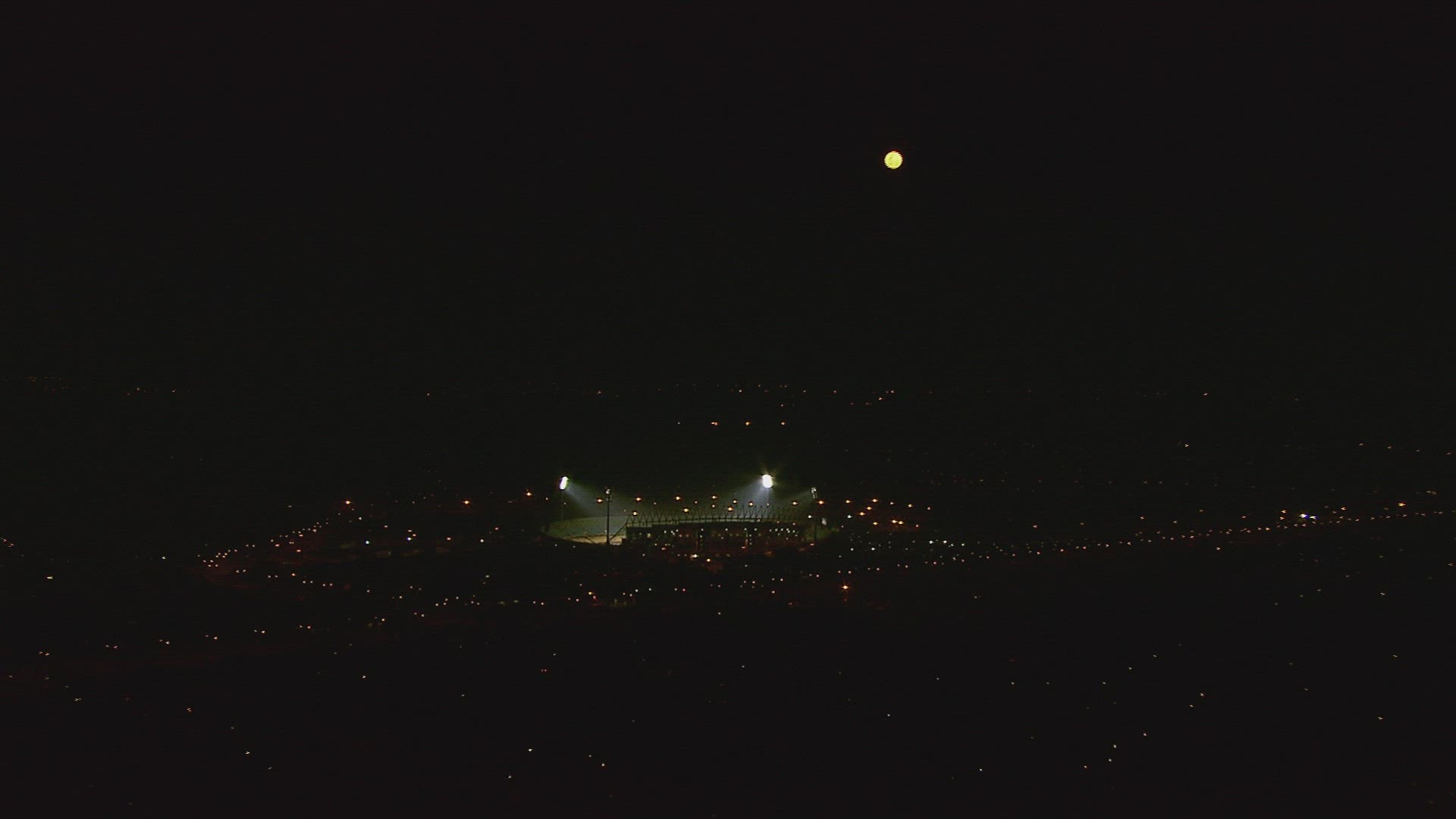 Slow motion shot of stadium stand full with people. They are lighting lamps in the dark.