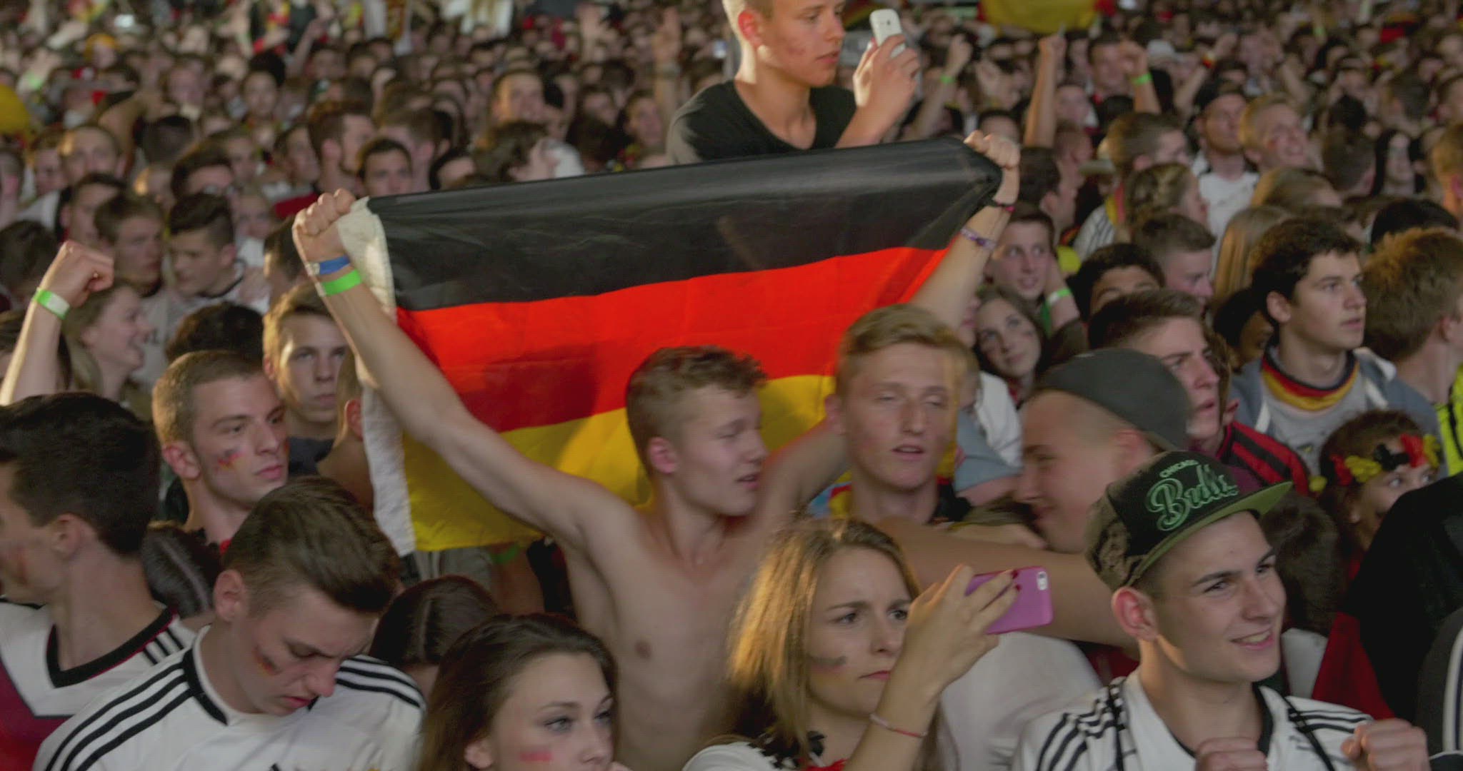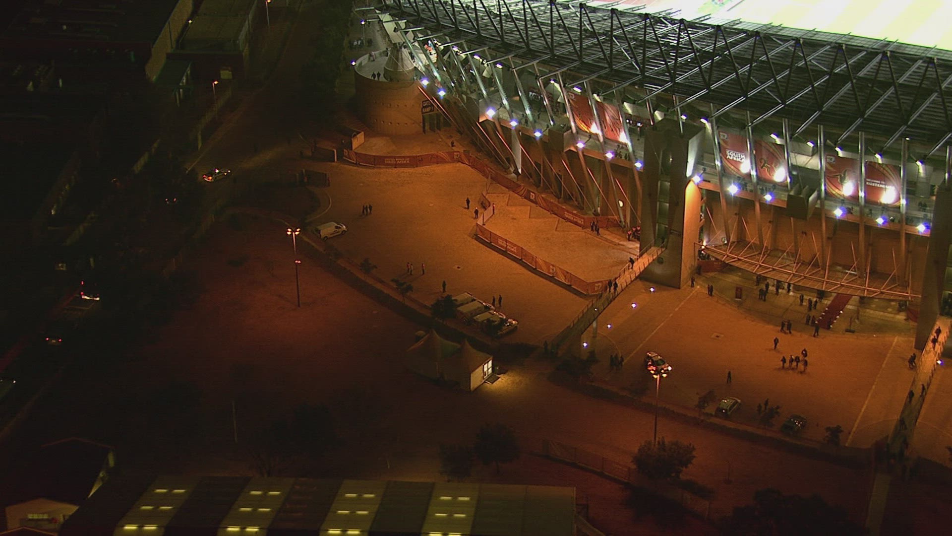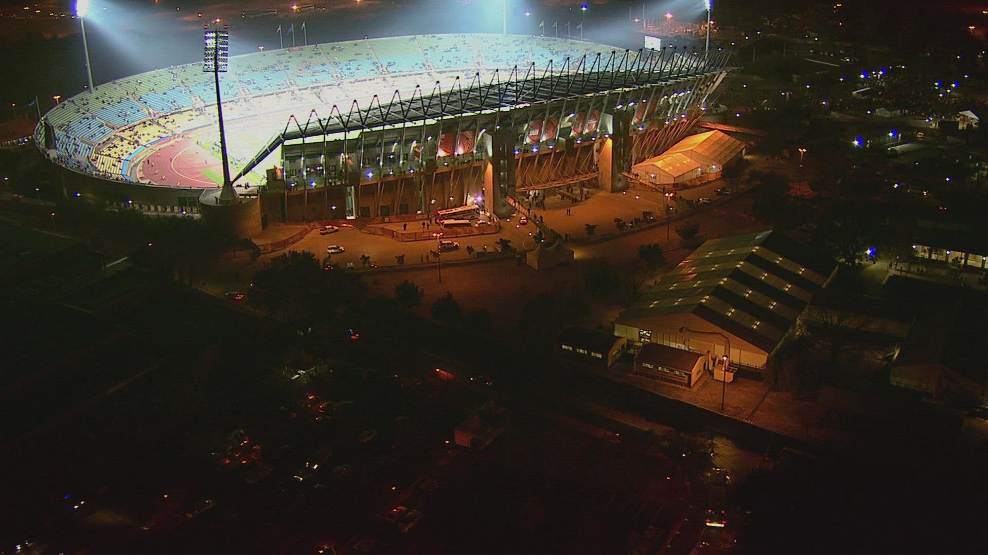 Slow motion shot of stadium stand full with people. They are lighting lamps in the dark.