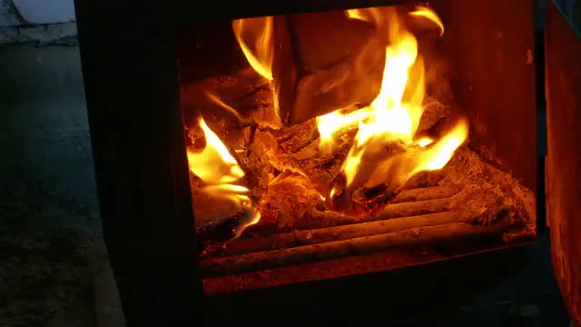 Slow motion of burning fire in red wood-fired pizza oven, heat sensor outside
