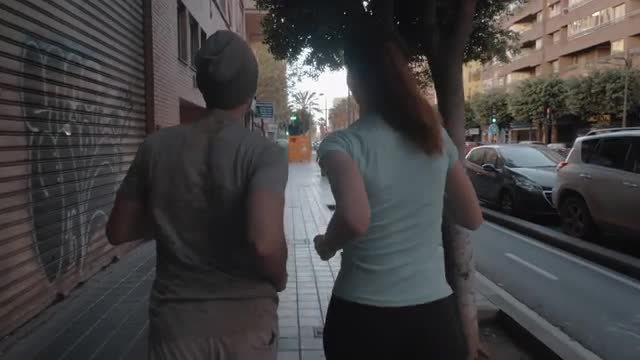 Slow motion steadicam shot of happy young man and woman jogging in the city street. Start your morning with healthy run