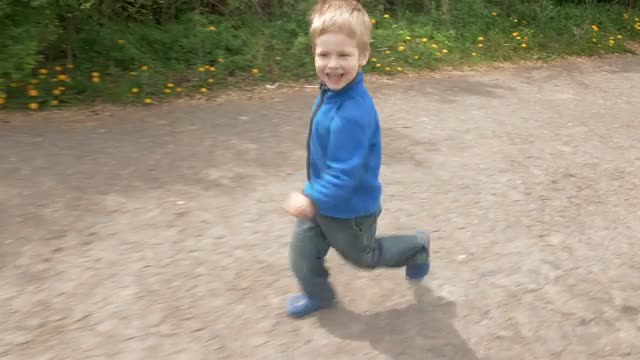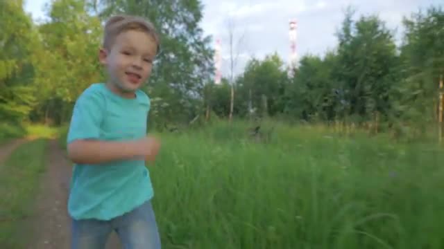Slow motion steadicam shot of little boy in blue shirts and jeans running in green park on background of bloomy trees. Happy carefree childhood