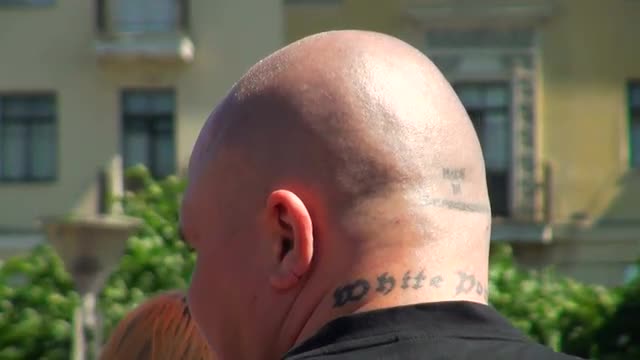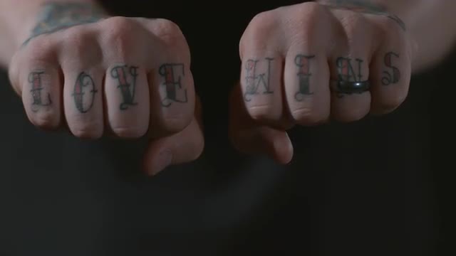 > Man with tatooed fingers shows fists in slow motion; shot on Phantom Flex 4K at 1000 fps
