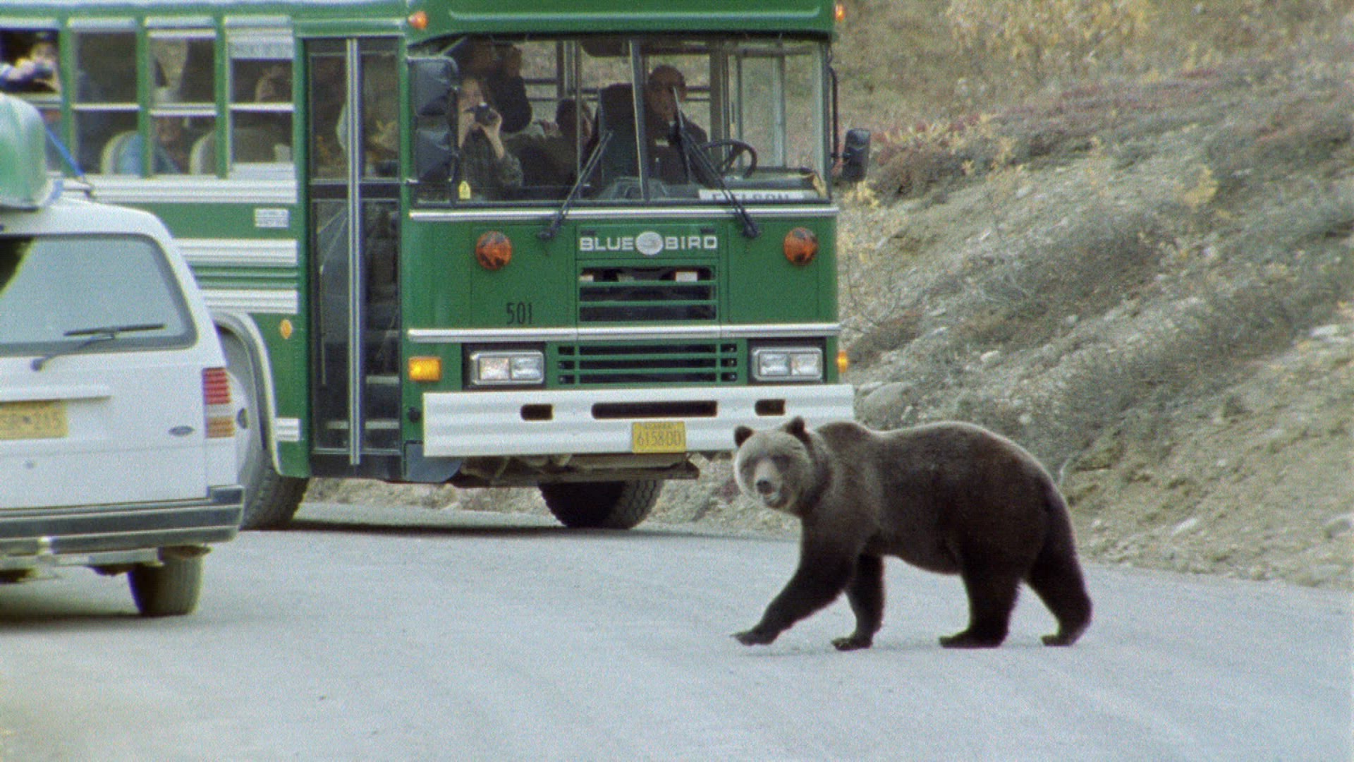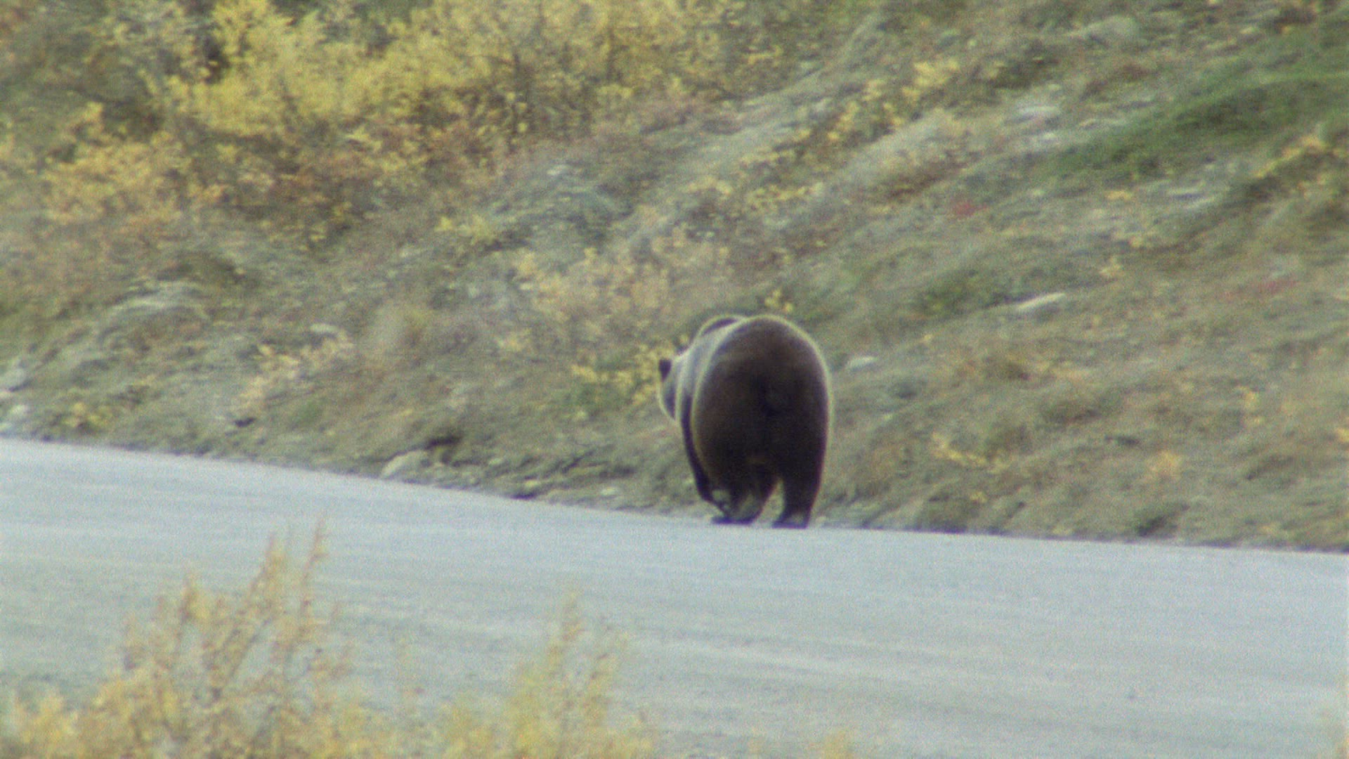 > 1961: Grizzly bear mom and young cubs on side of road.