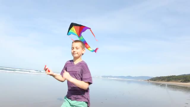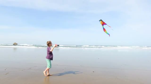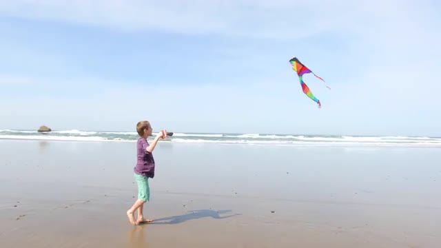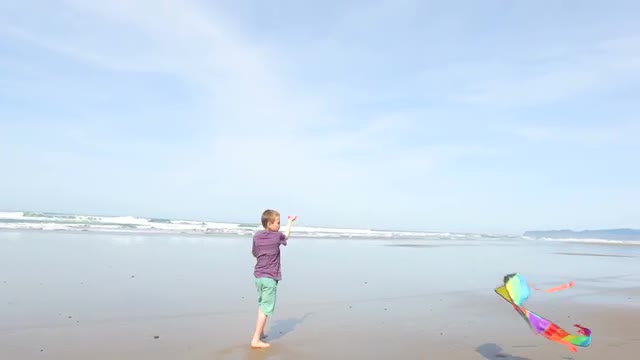 Young boy flying kite at beach