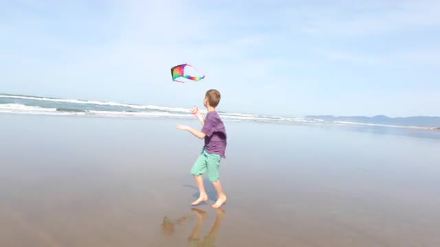 > Young boy flying kite at beach
