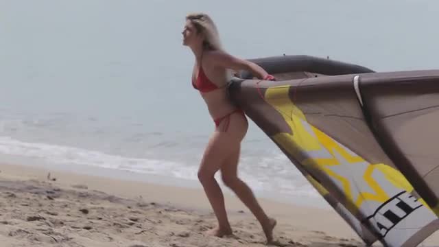 695592 - WS TU Young blonde woman dragging surf kite up beach / Singapore