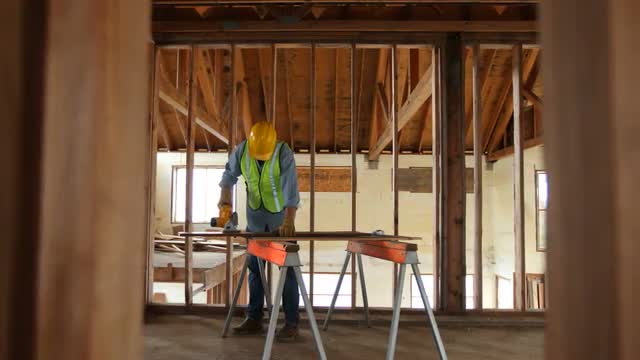Construction worker using digital tablet on work site
