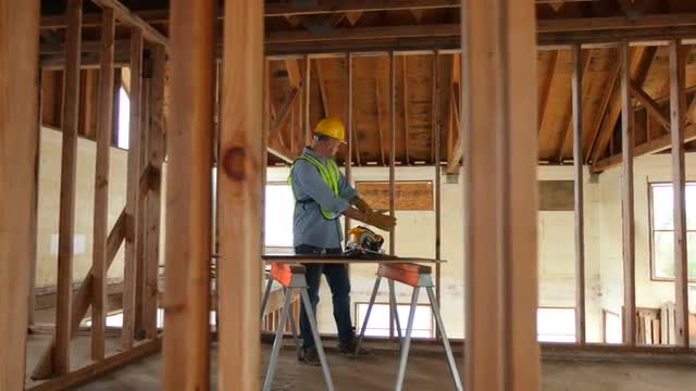 > Construction worker using digital tablet on work site