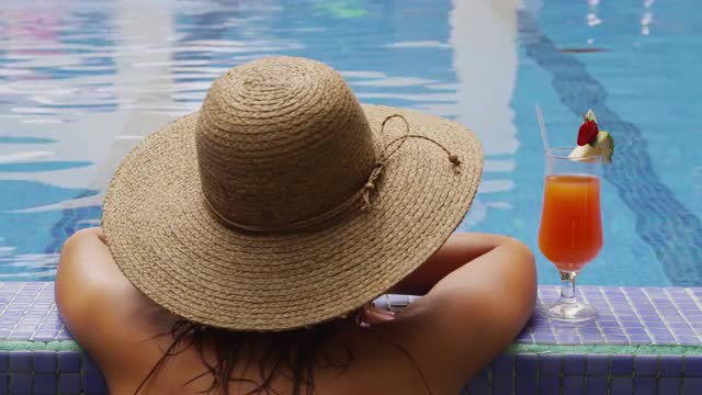 Woman with cocktail by pool. Shot on RED EPIC for high quality 4K, UHD, Ultra HD resolution.