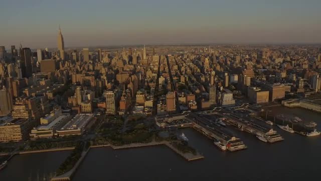 Aerial Midtown Manhattan Empire State Building skyscrapers City Avenue Expressway traffic ferry commuter New York RED EPIC