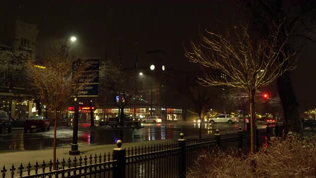 1092148 - View of downtown Provo at night during wet snowstorm
