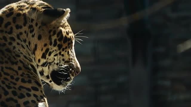 TRACKING: Portrait of Leopard resting in the zoo cage