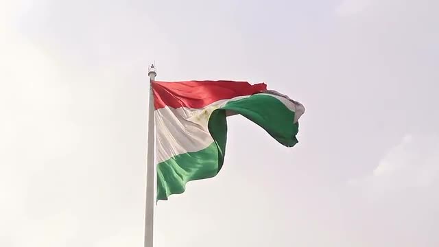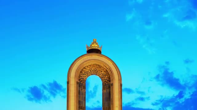 Dushanbe, Tajikistan - August 16, 2014: 13 meters high State coat of arms in hands of Somoni, and a crown on his head, covered with gold leaf. UltraHD (4K)