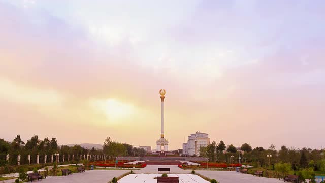 > Statue of Somoni at dawn. Dushanbe, Tajikistan. 4K