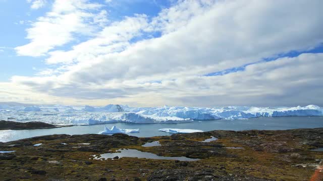 Time lapse clouds World Heritage Site Disko Bay Greenland icebergs climate change frozen remote melting icecap