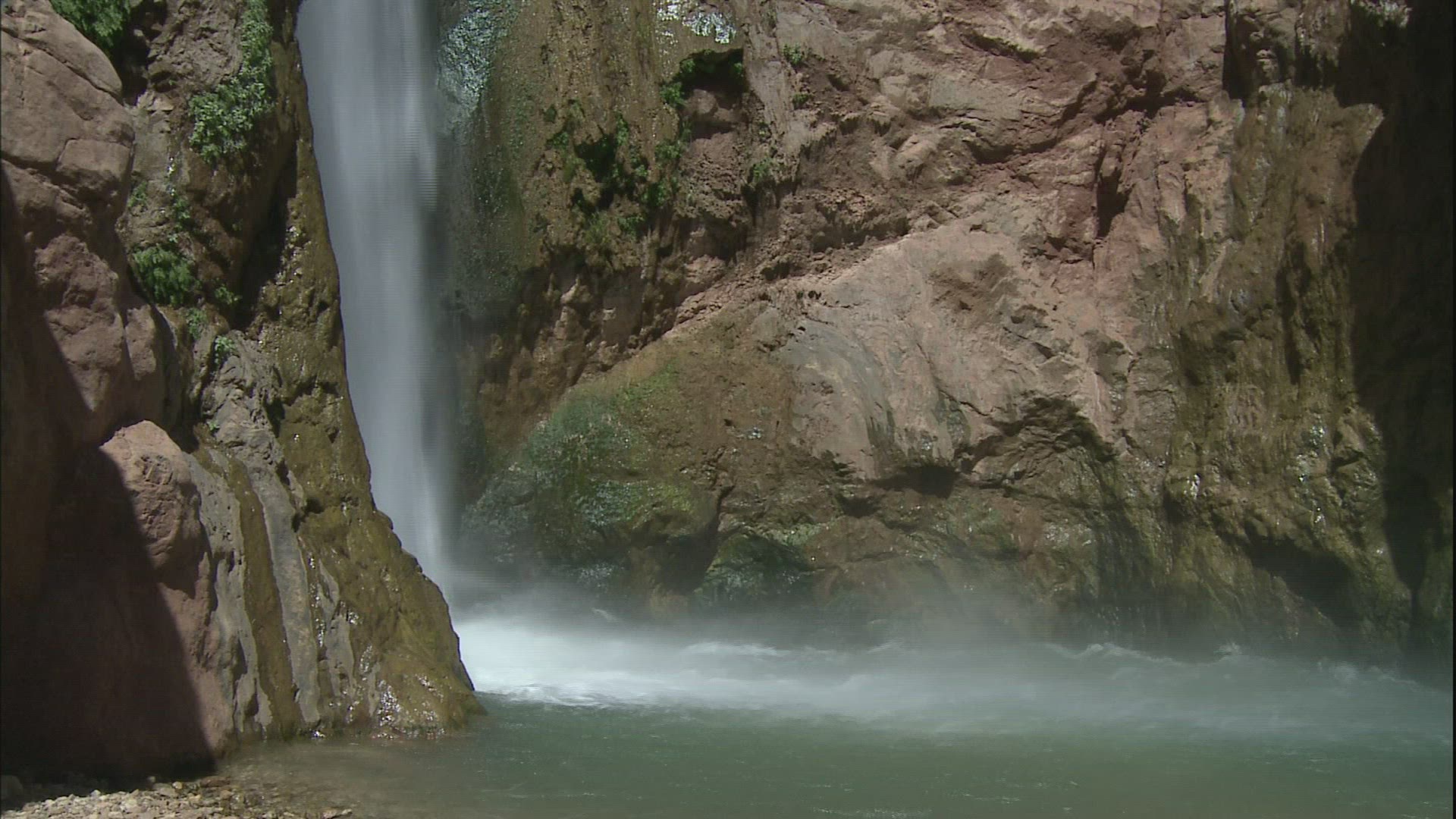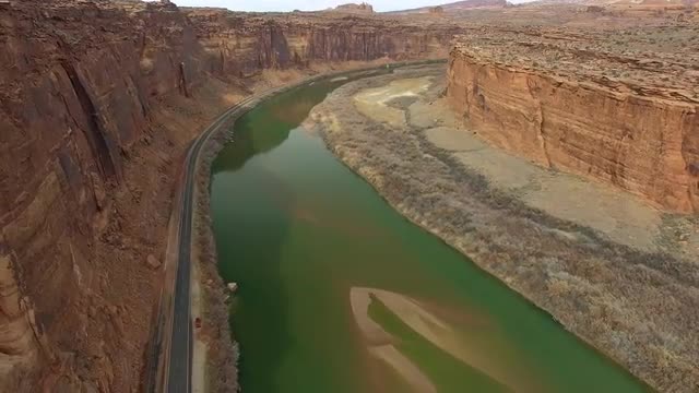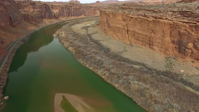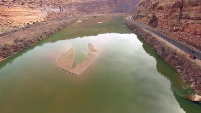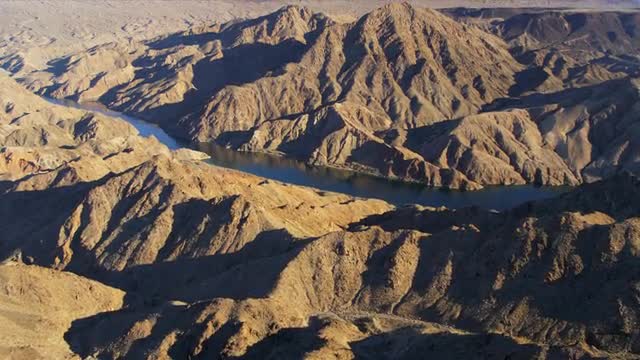 Aerial view Red Rock Colorado River inflow from Grand Canyon to Lake Mead reservoir Southeast Las Vegas, Arizona Nevada, USA, RED EPIC