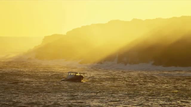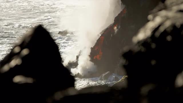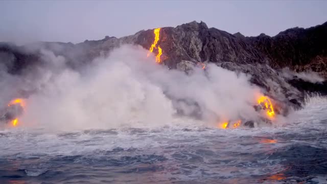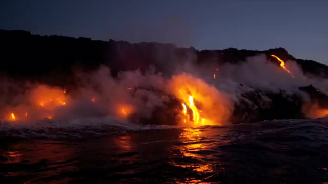 Steam produced by volcanic lava falling from Kilauea Hawaii before sunrise into ocean shot on RED EPIC