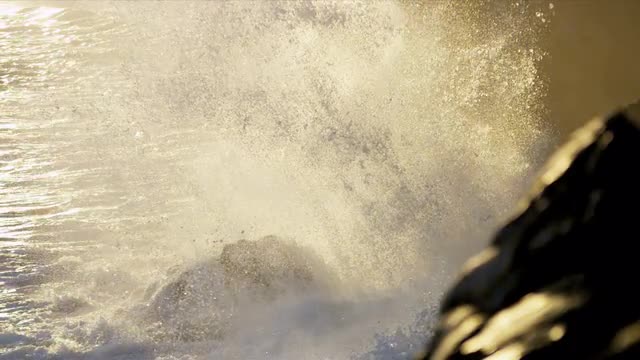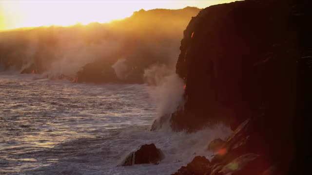 Fire from red hot lava seen sunset as lava pours into ocean Kilauea Big Island shot on RED EPIC
