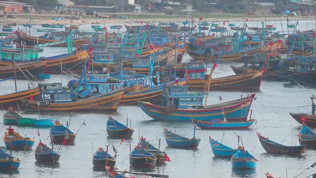 MUI NE, VIETNAM - FEBRUARY 4, 2014: Fishing boats and barges in the bay near the village of Mui Ne, Vietnam