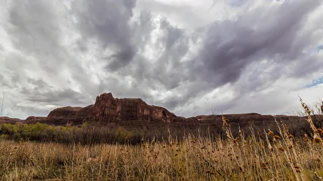 1067813 - Red rock sandstone fins in the Utah Desert, as clouds move through the sky