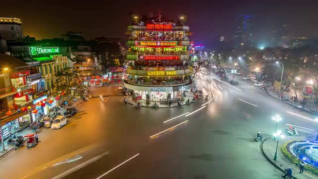 4K UHD Timelapse footage (250 frames) of traffic at a busy intersection in the center of Hanoi, Vietnam.
