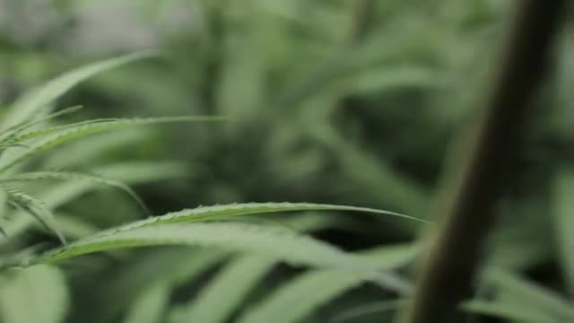 Large bud on mature marijuana plant with leaves being clipped off and time sped up