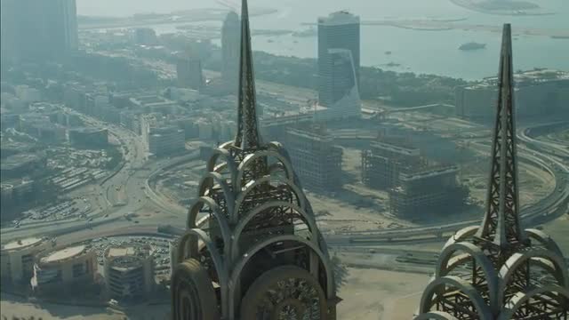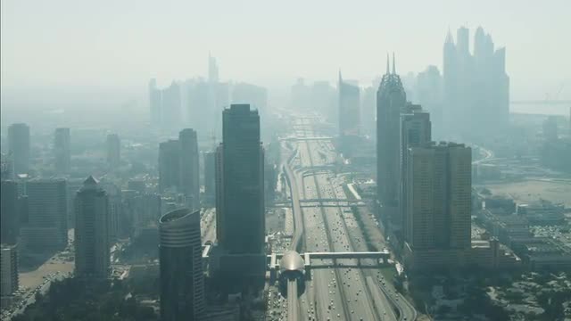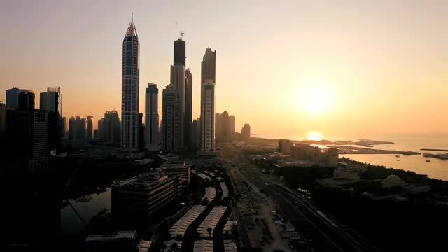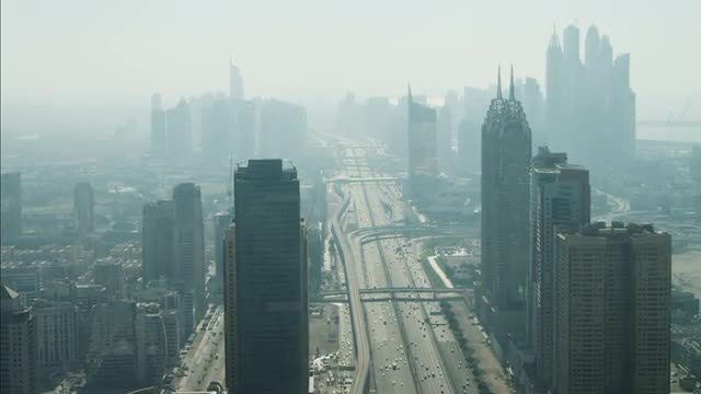 Time lapse illuminated night view of road system under construction city skyscrapers desert environment, Middle East