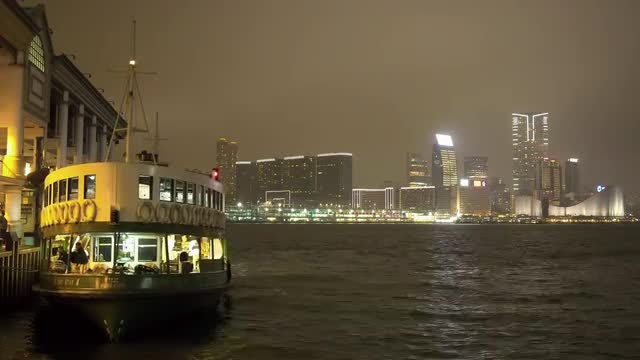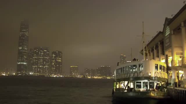 Hong Kong time lapse illuminated night view Victoria Harbour city traffic and exterior buildings, Far East, Asia