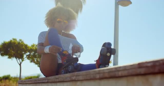 Slow Motion Video of Girl With Afro Haircut Puting Her Roller Skates While Sitting on Fountain Wall