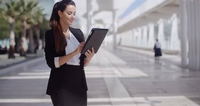 Elegant businesswoman standing on a seafront promenade holding a tablet computer in her hands looking at the camera