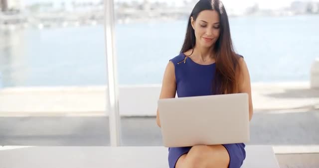 Attractive young woman sitting on a waterfront bench using a laptop computer sitting smiling at the camera with a thoughtful expression with copyspace
