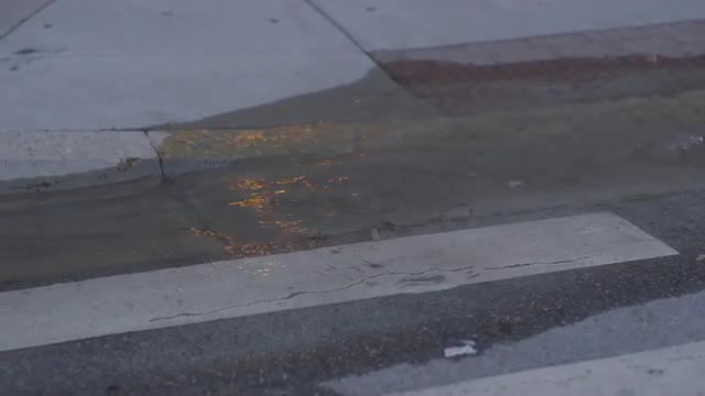 Close-up of people footsteps. Puddles after rain